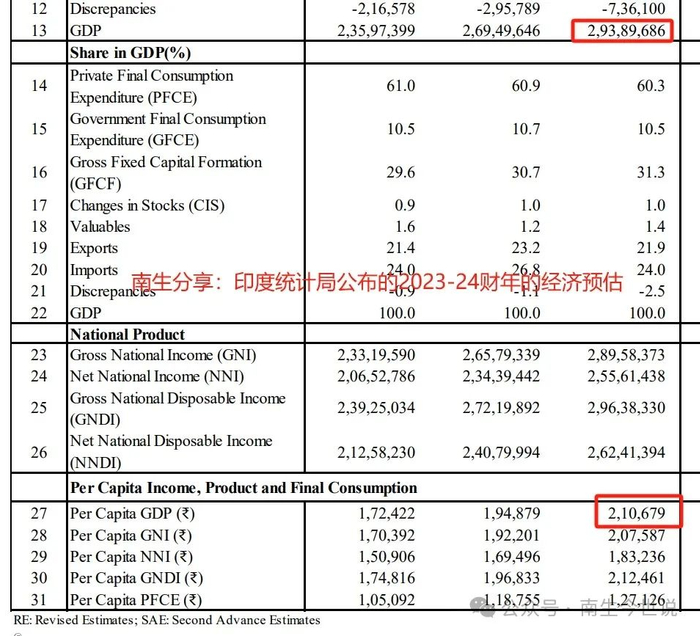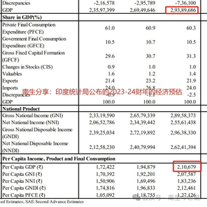 印度国家统计局在公布2023年第四季度经济成绩单的同时,还发布了另外一组“并未引起媒体关注的数据”,即预计:2023-24财年的经济总规模为293.9万亿卢比(如下图),同比实际增长7.7%。