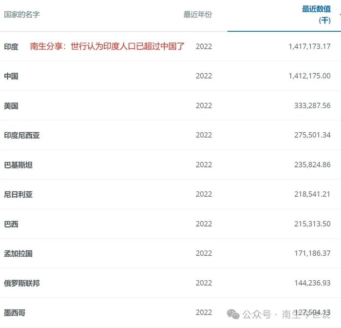例如世界银行,它的数据库中就显示:印度人口在2022年就超过了14.17亿(如上图),当时我国人口在14.12亿左右,比印度少了500万。而世界人口组织却是在2023年4月10日发布的消息。