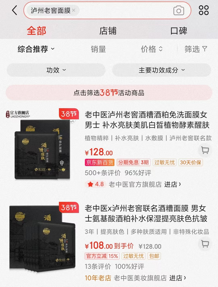 在茅台之前,已有多个白酒品牌推出联名产品,但都未泛起太大水花。3月7日,《消费者报道》在京东平台搜索泸州老窖联名产品酒糟醒肤修护面膜,相关产品页面显示“已售500+”,销售量停留在三位数。