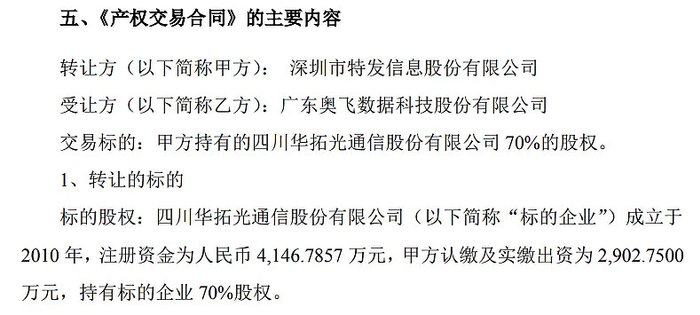 3月18日,特发信息发布的挂牌转让控股子公司股权事项进展公告显示,四川华拓成立于2010年,注册资本4146.7857万元,特发信息认缴并实缴2902.75万元,持有70%股权。