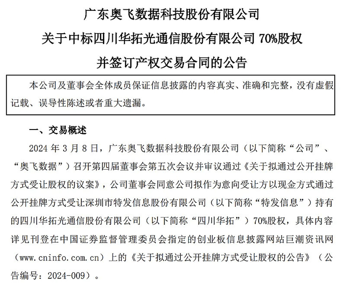 3月15日,奥飞数据公告,中标四川华拓光通信股份有限公司70%股权并签订产权交易合同。在此之前,3月8日,公司曾公告拟作为意向受让方以现金方式通过公开挂牌方式受让特发信息持有的四川华拓70%股权。根据3月15日公告,确认公司为四川华拓70%股权的受让方,成交价格为1.17亿。