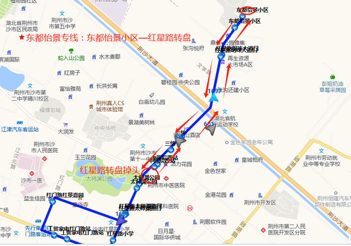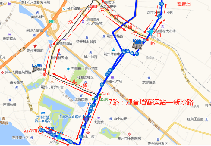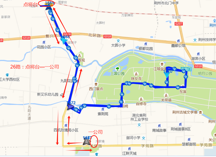 18路线路1:西门—黄金堂,途经路段:荆中路—屈原路—荆南路—黄金堂路—荆东路—荆中路;