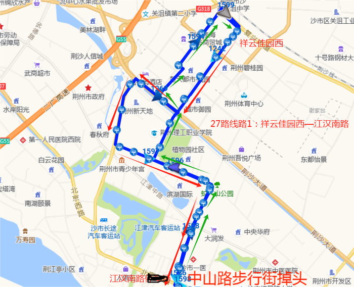 27路线路1:祥云佳园西—江汉南路,途经路段:江汉南路—江汉北路—长港路—工农路—荆沙大道—东岳路—(复兴大道—工农路—荆沙大道—塔桥北路—长港路);