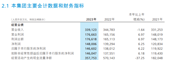 招行2023年报显示,该行去年营业收入为3391.23亿元,同比下降1.64%,此为该行自2009年后的首次营收增速转负;归母净利润为1466.02亿元,同比增长6.22%,日均净利润超过4亿元。