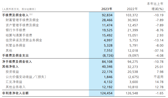 另外,该行在2023年报中提出,将从三方面推动非利息净收入保持高质量发展。具体来看,一是继续推进大财富管理业务发展,财富管理客群扩面和挖潜并重,加大产品创新力度,挖掘重点客户的资产配置潜力,密切关注权益市场回暖机遇,优化保险、基金、理财等产品结构,量价并举,提升财富管理手续费及佣金收入贡献;二是把握消费复苏机遇,持续升级和完善信用卡、电子支付等基础交易服务,大力开展促绑卡和促活跃经营,借助金融科技力量提升精细化运营能力,实现交易收入的挖潜增收;三是加强市场研判和专业能力建设,紧跟企业需求,提前布局,完善综合化服务体系,提升公司金融、投行与金融市场板块对非利息净收入的贡献。