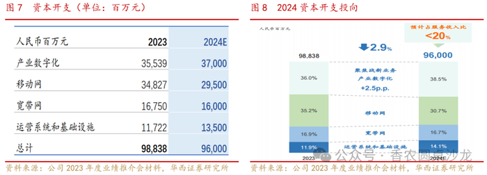 聚焦战新业务,加速智算布局。2023年公司总计资本支出为988.4亿元。其中,产业数字化占比最大,共投入355.4亿元,推动云智一体深入融合,算力由IDC向AIDC升级,实现智算11.0eflops,通算4.1eflops。