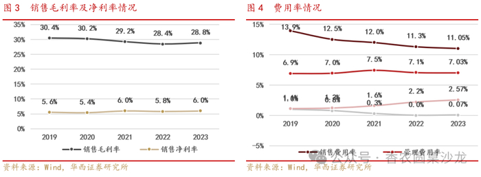 公司成本费用控制成效显著,2023年销售毛利率28.8%,同比增加0.4pct;销售净利率6.0%,同比增加0.2pct。