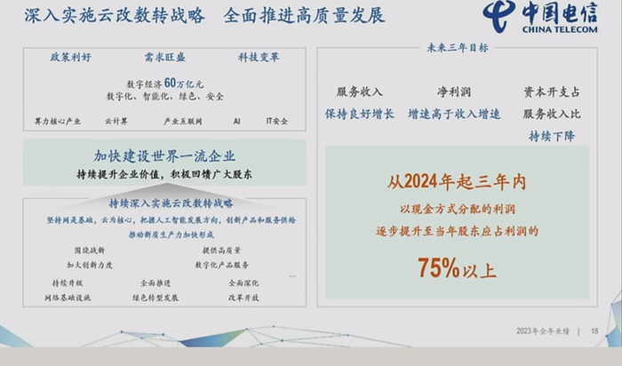 在这次发布会上,中国电信表示:“从2024年起,三年内以现金方式分配的利润逐步提升至当年股东应占利润的75%以上,努力为股东创造更大价值。”