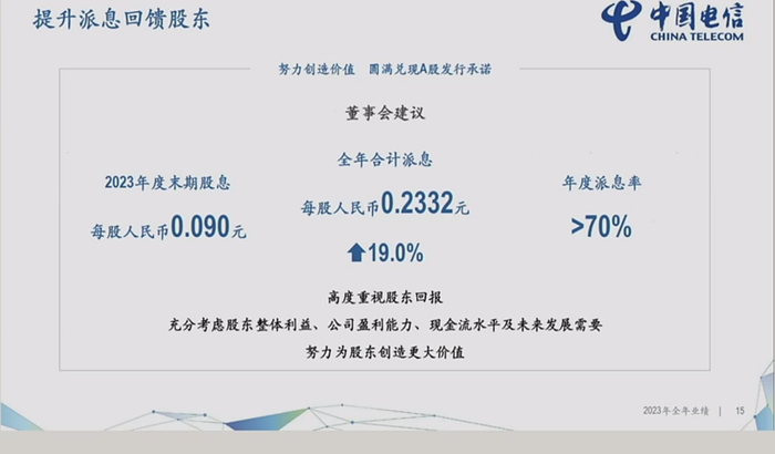 2023年,中国电信派发末期股息每股0.090元(含税),加上2023年中期已派发股息每股0.1432元(含税),2023年全年股息为每股0.2332 元(含税),合计人民币约213.39亿元,超过2023年度公司股东应占利润的70%。也就是说,中国电信圆满兑现了A股发行时的承诺。