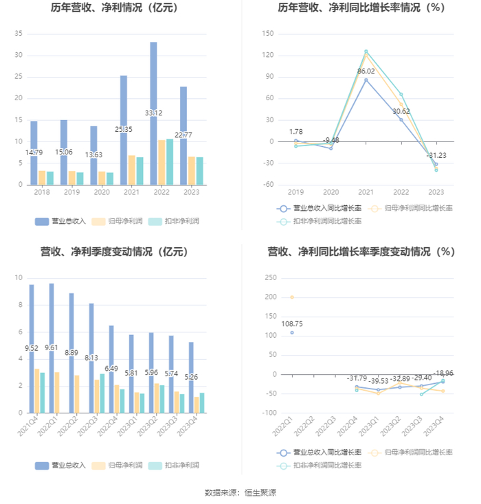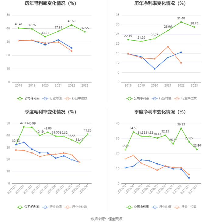 2023年,公司毛利率为37.55%,同比下降5.14个百分点;净利率为28.75%,较上年同期下降2.65个百分点。从单季度指标来看,2023年第四季度公司毛利率为41.20%,同比上升1.65个百分点,环比上升7.73个百分点;净利率为22.84%,较上年同期下降9.41个百分点,较上一季度下降5.01个百分点。