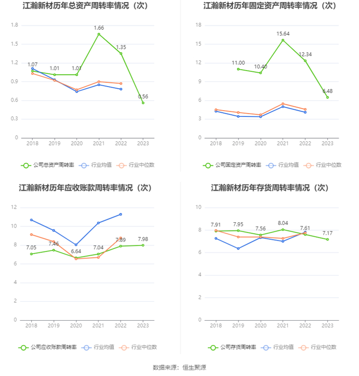 营运能力方面,2023年,公司公司总资产周转率为0.56次,上年同期为1.35次(2022年行业平均值为0.78次,公司位居同行业1/10);固定资产周转率为6.48次,上年同期为12.34次(2022年行业平均值为4.10次,公司位居同行业1/10);公司应收账款周转率、存货周转率分别为7.98次、7.17次。