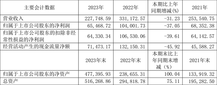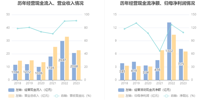 2023年,公司经营活动现金流净额为7.15亿元,同比下降45.92%;筹资活动现金流净额17.39亿元,同比增加16.32亿元;投资活动现金流净额-21.55亿元,上年同期为-4.26亿元。