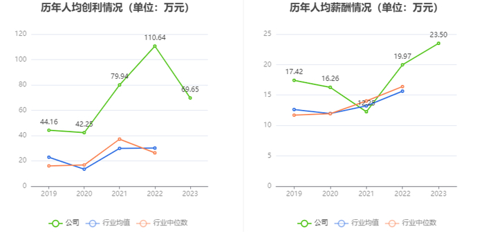 截至2023年末,公司员工总数为940人,人均创收242.29万元,人均创利69.65万元,人均薪酬23.50万元,较上年同期分别变化-31.23%、-37.05%、17.67%。
