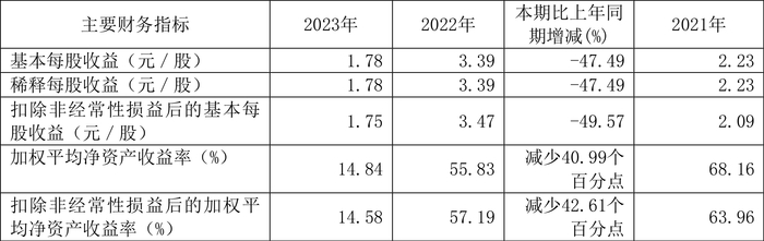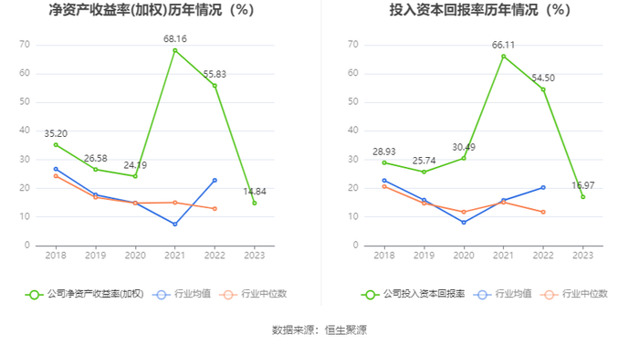 数据显示,2023年公司加权平均净资产收益率为14.84%,较上年同期下降40.99个百分点;公司2023年投入资本回报率为16.97%,较上年同期下降37.53个百分点。