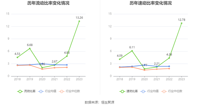 2023年,公司流动比率为13.26,速动比率为12.78。