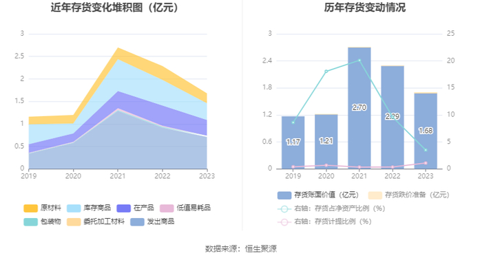 从存货变动来看,截至2023年末,公司存货账面价值为1.68亿元,占净资产的3.51%,较上年末减少6160.12万元。其中,存货跌价准备为184.71万元,计提比例为1.09%。