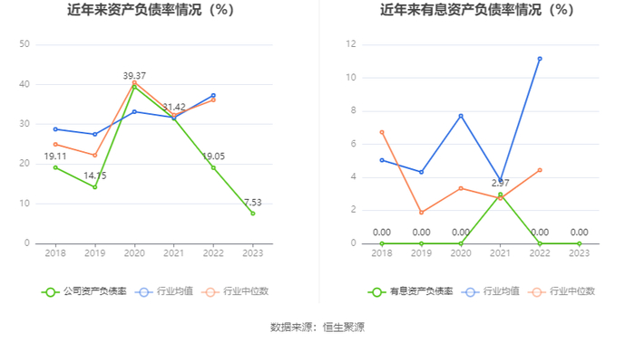 在偿债能力方面,公司2023年年末资产负债率为7.53%,相比上年末下降11.52个百分点;有息资产负债率为0.00%,相比上年末基本持平。