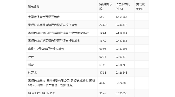 年报显示,2023年年末公司十大流通股东中,新进股东为景顺长城基金-国新投资有限公司-景顺长城基金-国新6号(QDII)单一资产管理计划(价值组)、BARCLAYS BANK PLC,取代了三季度末的鲁士杰、华商新趋势优选灵活配置混合型证券投资基金。在具体持股比例上,景顺长城能源基建混合型证券投资基金、景顺长城价值边际灵活配置混合型证券投资基金、景顺长城沪港深精选股票型证券投资基金持股有所上升,京投汇2号私募证券投资基金持股有所下降。