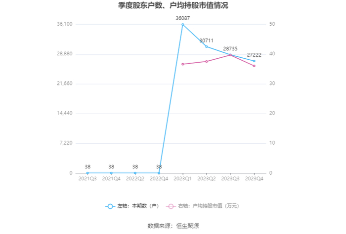 筹码集中度方面,截至2023年年末,公司股东总户数为2.72万户,较三季度末下降了1513户,降幅5.27%;户均持股市值由三季度末的39.70万元下降至36.06万元,降幅为9.17%。