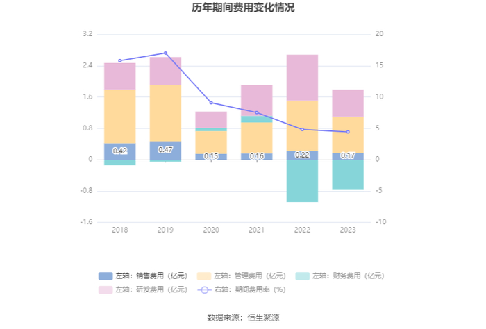 2023年,公司期间费用为1.01亿元,较上年同期减少5848.67万元;期间费用率为4.44%,较上年同期下降0.38个百分点。其中,销售费用同比下降22.45%,管理费用同比下降28.29%,研发费用同比下降41.21%,财务费用由去年同期的-1.08亿元变为-7711.65万元。