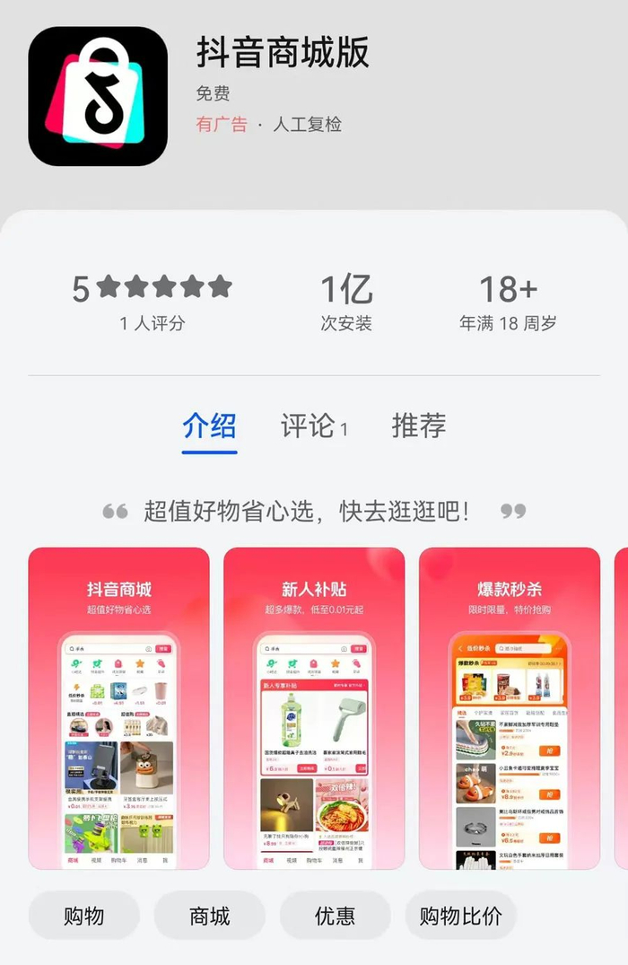 近日,抖音电商正式上线了”抖音商城版“App,消息一出立刻引发市场关注。目前该App只能在安卓系统的手机应用商店搜索下载,苹果App store暂无法下载。