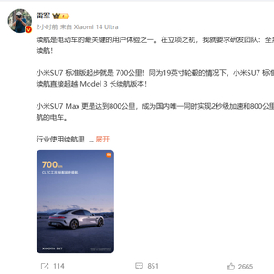 财联社3月27日讯,小米集团董事长雷军发布微博称,续航是电动车的最关键的用户体验之一。在立项之初,我就要求研发团队:全系长续航。小米SU7标准版起步就是 700公里。同为19英寸轮毂的情况下,小米SU7标准版续航直接超越Model 3长续航版本!小米SU7 Max更是达到800公里,成为国内唯一同时实现2秒级加速和800公里续航的电车。