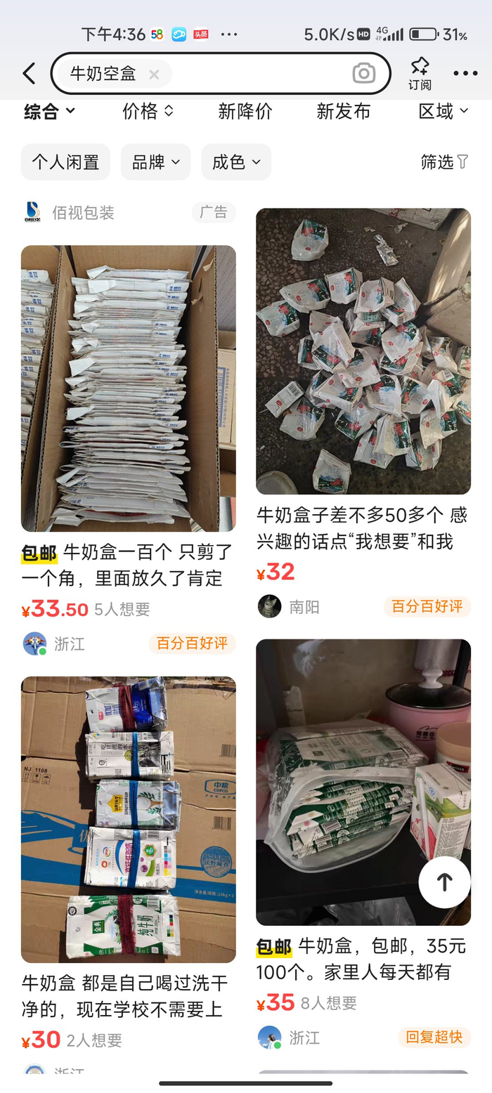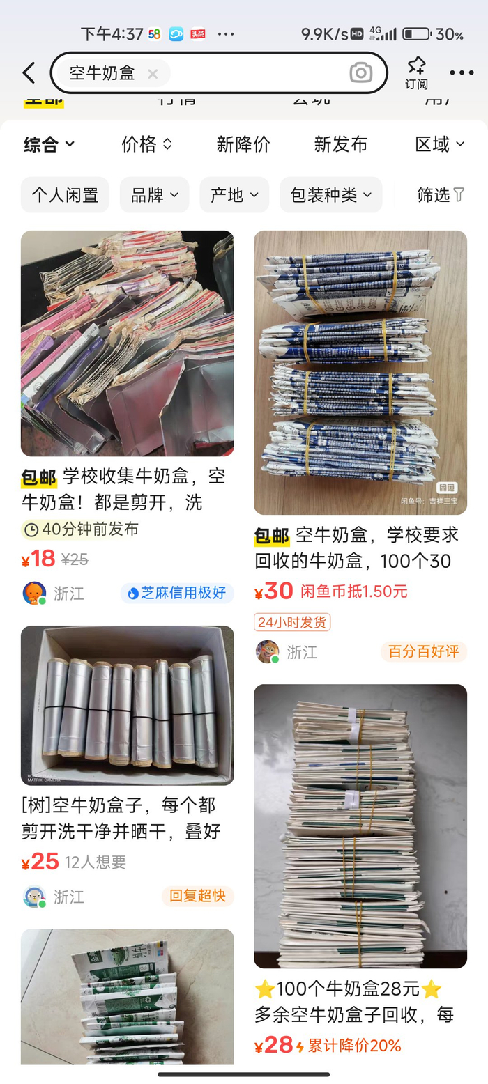 喝牛奶后剩下的空纸盒子,原本只能按废纸卖,目前行价是5毛钱左右一斤,每个空牛奶盒子重15克,也就是约35个空牛奶盒子才能卖5毛钱,一个才不到2分钱。但最近记者在闲鱼上发现,有商家将100个空牛奶盒子卖到30块钱,合3毛钱一个。价格涨了20多倍,成了废纸回收种类里最贵的。