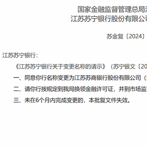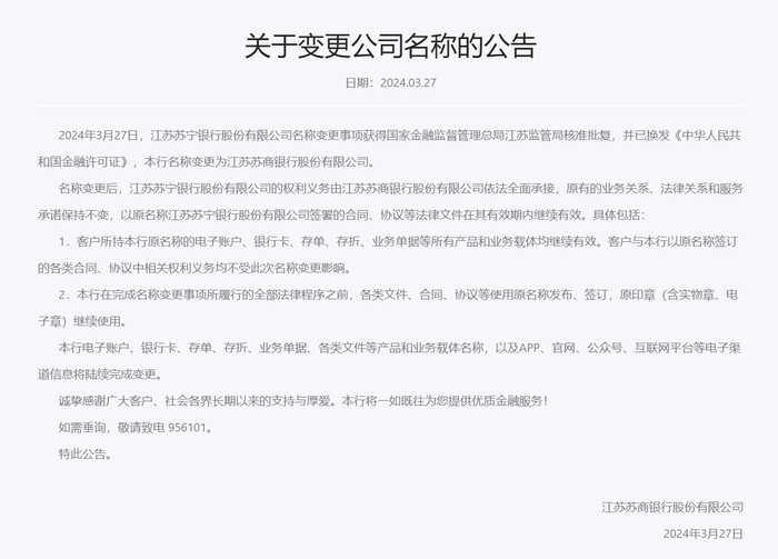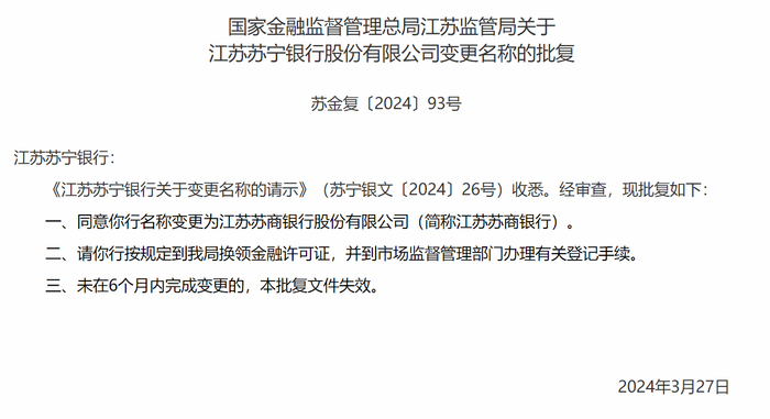 3月27日,国家金融监督管理总局江苏监管局核准批复“江苏苏宁银行”更名为“江苏苏商银行”。