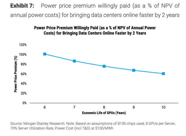 研报举例,如果一个数据中心开发商能够比其他数据中心开发商早两年确保电力来源,在假设GPU的经济寿命为六年的情况下,开发商愿意支付约101%的电价溢价,或者假设10年的经济寿命时,支付约61%的电价溢价。