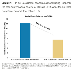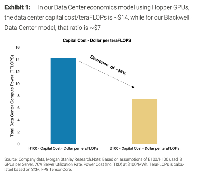 研报表示,生成式人工智能的算力成本将迅速下降,但市场这一情况有所低估。大摩的数据中心模型显示,从英伟达H100的Hopper GPU转为使用B100的Blackwell GPU时,数据中心每秒浮点运算次数(teraFLOP)的资本成本下降了约50%。大摩表示,这一数字是数据中心总资本成本与数据中心每秒浮点运算次数之比,可能有助于确定生成式人工智能商业模式是否会产生较高的投资回报率。