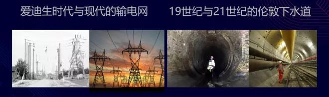 我们再来看两个对比例子:输电网,爱迪生时代与现代的对比;伦敦下水道,19世纪与21世纪的对比。这两个对比也得出与上个例子类似的两个观察: