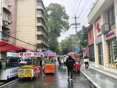 27日下午,记者来到抚琴夜市走访看到,在抚琴西南街的两处位置,均有环卫工人开着环卫车冲洗地面。尽管下着雨,下午4点半,已有数十家摊贩开始整理摊位,准备出摊。另外,从抚琴地铁口往抚琴夜市走的路上,也有几家小摊贩售卖食物。