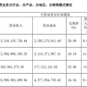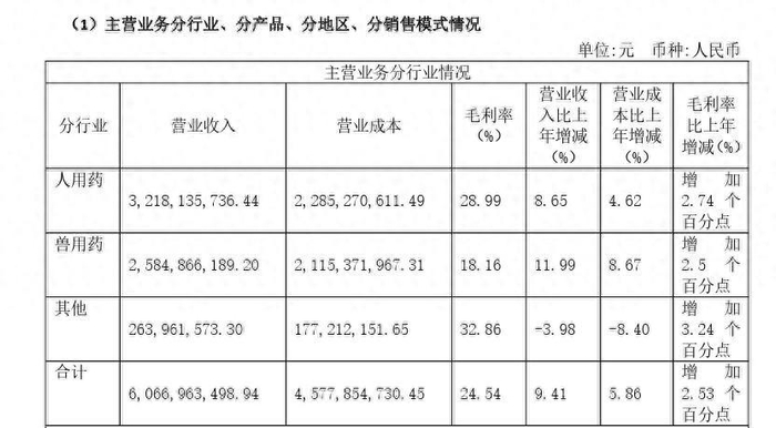 分行业来看,鲁抗医药的主营业务可分为人用药、兽用药和其他。报告期内,公司人用药实现营业收入32.18亿元,同比增长8.65%;毛利率为28.99%,同比增加2.74个百分点。公司兽用药实现营业收入25.85亿元,同比增长11.99%;毛利率为18.16%,同比增加2.5个百分点。根据财务数据,2023年度,鲁抗医药销售毛利率为24.54%,同比增加2.53个百分点。