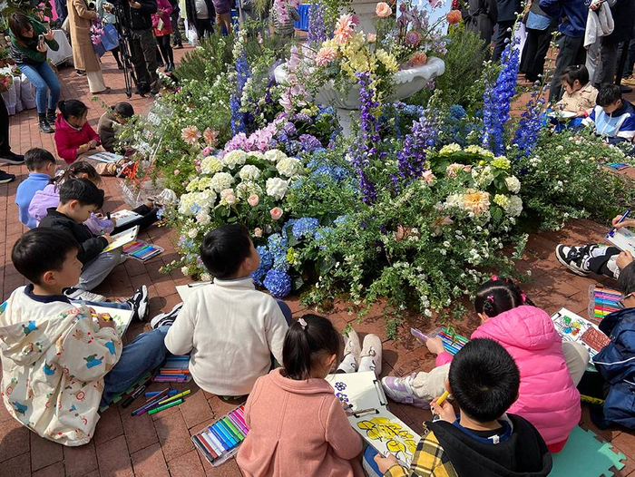 穿过白紫相间的蝴蝶兰拱门,经过缤纷花境和鲜花铺满的拍照点,在销售区域可以了解各种盆栽植物和鲜切花,听工作人员讲解花卉知识、养护技巧,还有一群小朋友围着“花卉喷泉”写生。大丽花、重瓣百合、原生郁金香、紫精灵康乃馨……200多个品种的花卉精心布置,供观赏、拍照和消费,销售价格在10元到几十元不等。