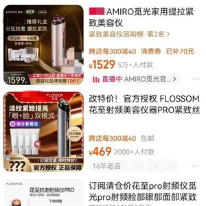 “原价4654元的花至抗老射频仪pro,现在只要1899元”“限时直降2000元,极萌大熨斗12极射频美容仪只需1619元”“立减2100元起,觅光射频美容仪降至1529元”……