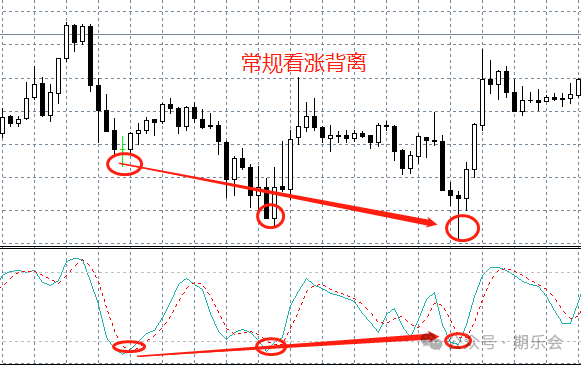常规看涨背离:在下跌趋势中,价格低点持续走低,但指标低点反而走高。