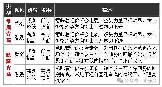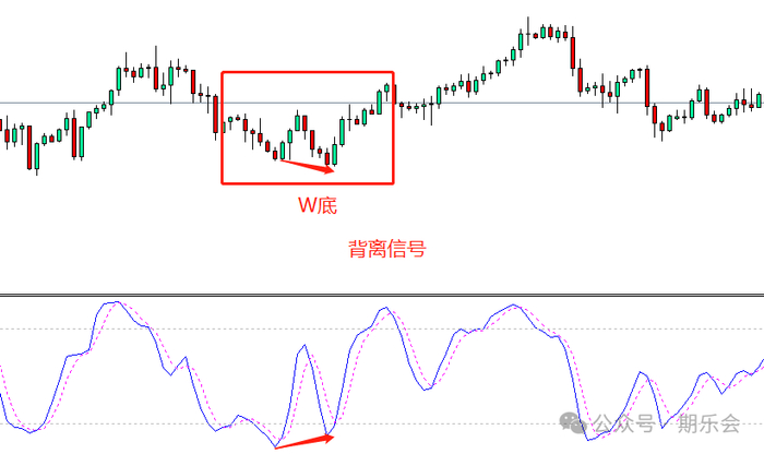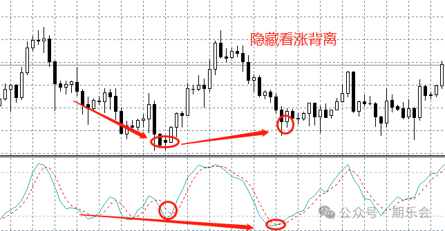 隐藏看涨背离:价格形成一个更高的低点,但指标持续走低。(期乐会官方微信公众号平台ID:qlhclub)