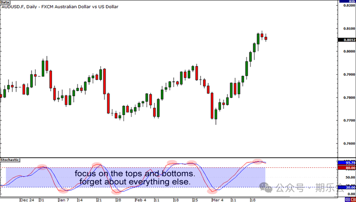 常用的技术指标是震荡指标MACD、RSI和KD指标。可以单独使用,也可以两者结合。如下图用到的是KD指标(Stochastic Oscillator)。