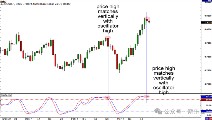 并且价格和指标的波动要垂直对齐。如下图所示,其实就是保证价格和技术指标高低点的同时性。当然有些技术指标比较滞后,不能保证完全垂直也是可以的。