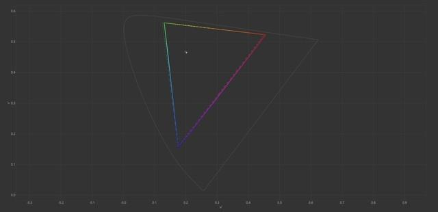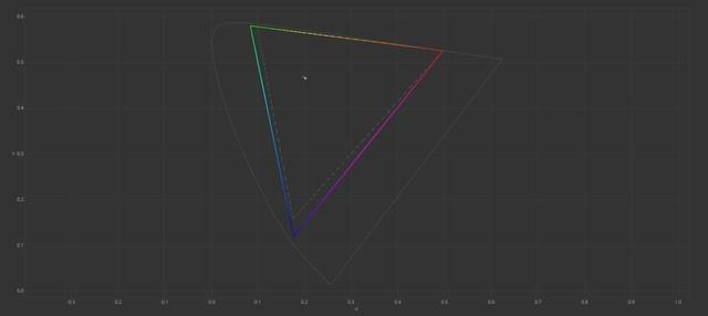 接下来参考三个模式下的色域覆盖。彩色区域是屏幕的实际表现,虚线是默认情况下的标准范围,可以看到原生色域、P3色域、sRGB色域的覆盖都达到了完美程度,足见这块屏幕的性能优势。