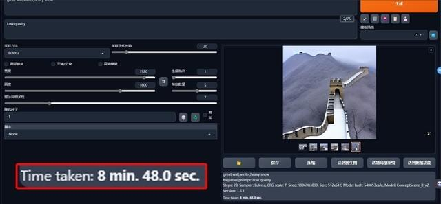 笔者试着使用华硕灵耀14双屏生成5张高质量图片,耗时8分48秒,单从核显的配置来说,整体效率还是可以的。
