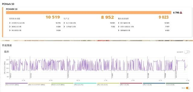 PCMark 10办公模式测试标准下,其在常用基本功能,包含Web浏览、视频会议、应用程序启动等得分为10519分,说明其完成这些基础办公任务没有任何问题;而在生产力项目测试中得分高达8952分,表明其拥有高效的电子表格、文档工作性能;数位内容创作方面,其评分为9024分,说明其能够非常高效地完成图片、视频、图形渲染等工作;综合得分6790分,综合表现出色。
