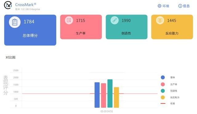 在CrossMark生产力性能测试中,其综合得分1784分,生产力单项得分1715分,创造力得分1990分,反应能力得分1445分,综合性能表现出色,应对日常办公应用完全没有压力。