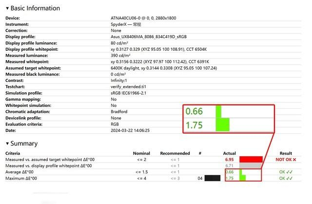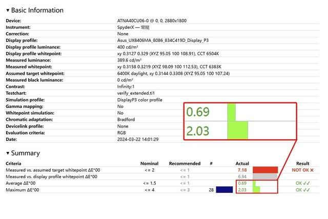可以看到这块屏幕平均色准ΔE值都在0.7以下,最高值也不过仅有2.03,色彩偏离度极低,色准极为精确。最后附上Display P3色域模式下的色准图谱,可以看到图谱上的所有色彩显示都非常精准,无愧“华硕好屏”概念。