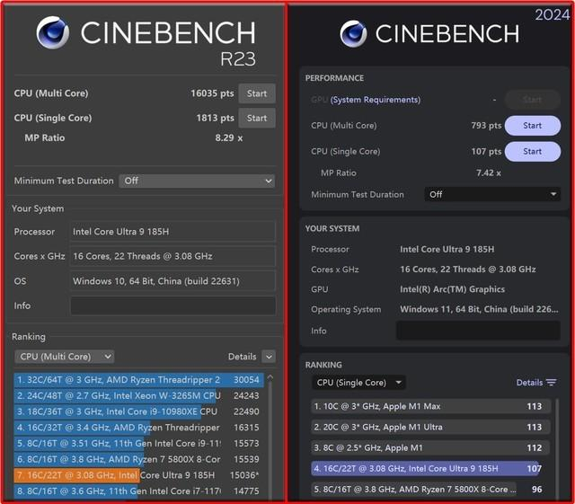CINEBENCH R23以及2024测试标准下,R23单核得分1813,多核得分16035分,整体表现出色;CINEBENCH 2024标准下,这颗处理器单核得分107,多核得分793。