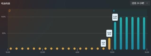 另外这款产品也支持快充,参考Windows 11系统电池电量信息,从早上9点3%电量开始充电,到上午11点左右,总计充电量达到85%,充电速度还是令人满意的。
