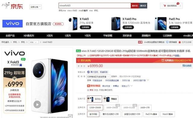 目前,来京东参与vivo X Fold3系列预售可享24期免息、以旧换新至高补贴2000元等福利,还可加299元抢包含1年全保维修+30天超长试用+200元复购补贴的意外无忧套装、加599/799元抢包含80%保值换新+1年全保维修+30天超长试用+200元复购补贴的保值无忧套装(其中,vivo X Fold3为加599元,vivoX Fold3 Pro为加799元)。此外,3月27日起,包括上海在内的30多座城市的消费者还可通过京东手机小时达入手vivo X Fold3系列,在京东APP搜索“vivo小时达”即可进入专属页面下单,新机将由vivo体验店极速发货,1小时到手新机,实现先人一步极速换新。
