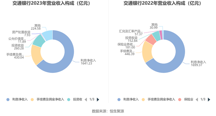 分产品来看,2023年公司主营业务中,利息净收入1641.23亿元,同比下降3.42%,占营业收入的63.71%;手续费及佣金净收入430.04亿元,同比下降3.66%,占营业收入的16.69%;投资收益260.28亿元,同比增长70.30%,占营业收入的10.10%。