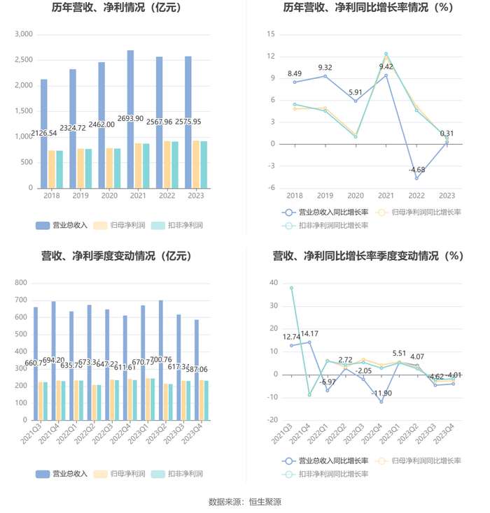 年报显示,2023年年末公司十大流通股东中,持股最多的为中华人民共和国财政部,占比23.88%。十大流通股东名单相比2023年三季报维持不变。在具体持股比例上,香港上海汇丰银行有限公司、香港中央结算(代理人)有限公司持股有所上升,香港中央结算有限公司持股有所下降。
