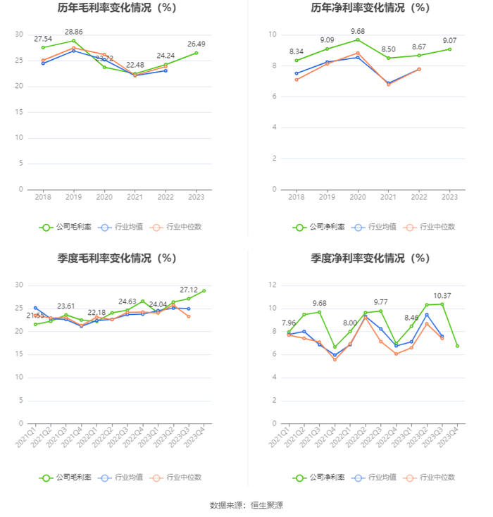 2023年,公司毛利率为26.49%,同比上升2.25个百分点;净利率为9.07%,较上年同期上升0.40个百分点。从单季度指标来看,2023年第四季度公司毛利率为28.82%,同比上升2.25个百分点,环比上升1.70个百分点;净利率为6.74%,较上年同期下降0.22个百分点,较上一季度下降3.63个百分点。